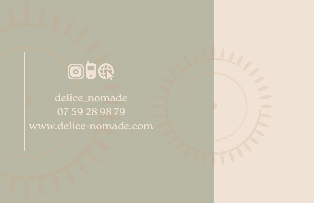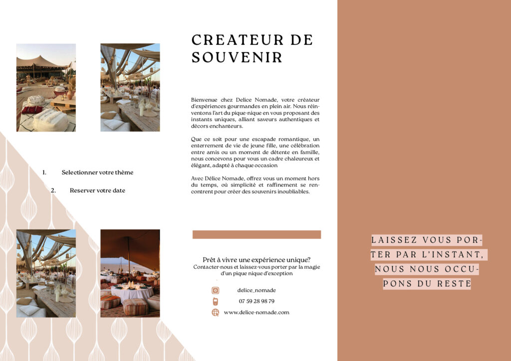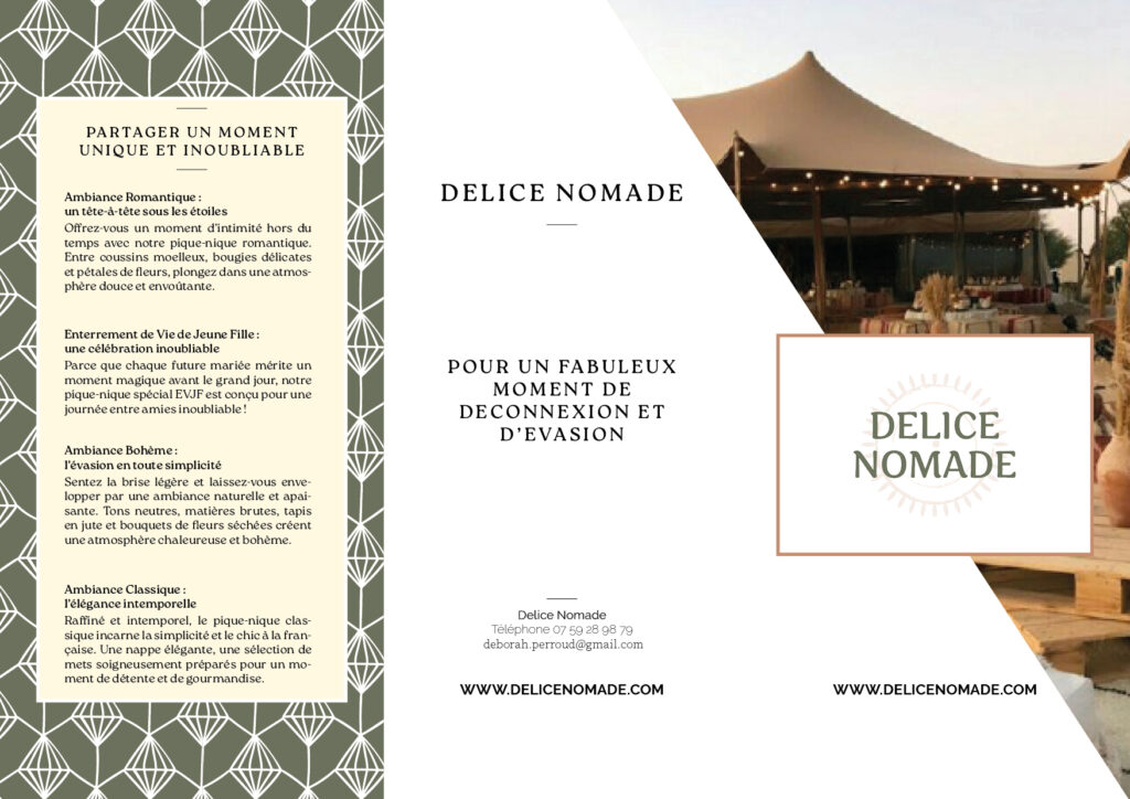 Délice Nomade est une identité visuelle imaginée pour une entreprise de pique-nique sur mesure. L’univers graphique mêle élégance et nature, avec une palette de tons terreux et verts doux. Le logo, la carte de visite et la brochure ont été conçus pour refléter une expérience raffinée en plein air.