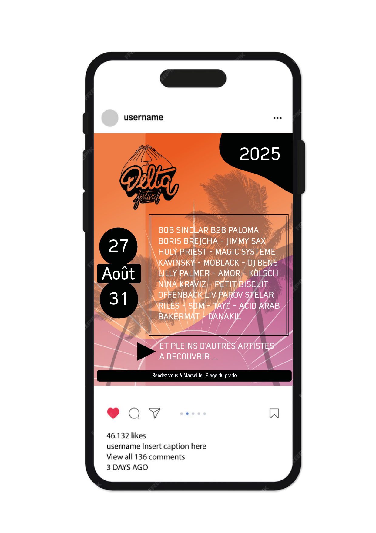 DELTA FESTIVAL, est un projet de campagne de communication pour un festival de musique. J’ai réalisé une affiche A1 et une série de posts Instagram en jouant sur une palette néon et contrastée, afin de refléter l’énergie festive de l’évènement. L’accent a été mis sur l’impact visuel et la hiérarchisation des informations.